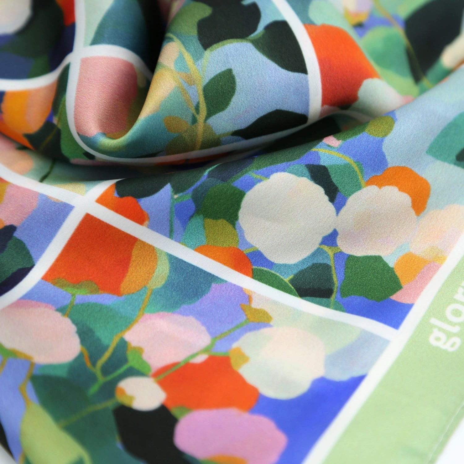 We work exclusively with natural fabrics. Currently, all our scarves are made from 100% silk. We plan to introduce wool-silk blends and cashmere scarves in the near future.